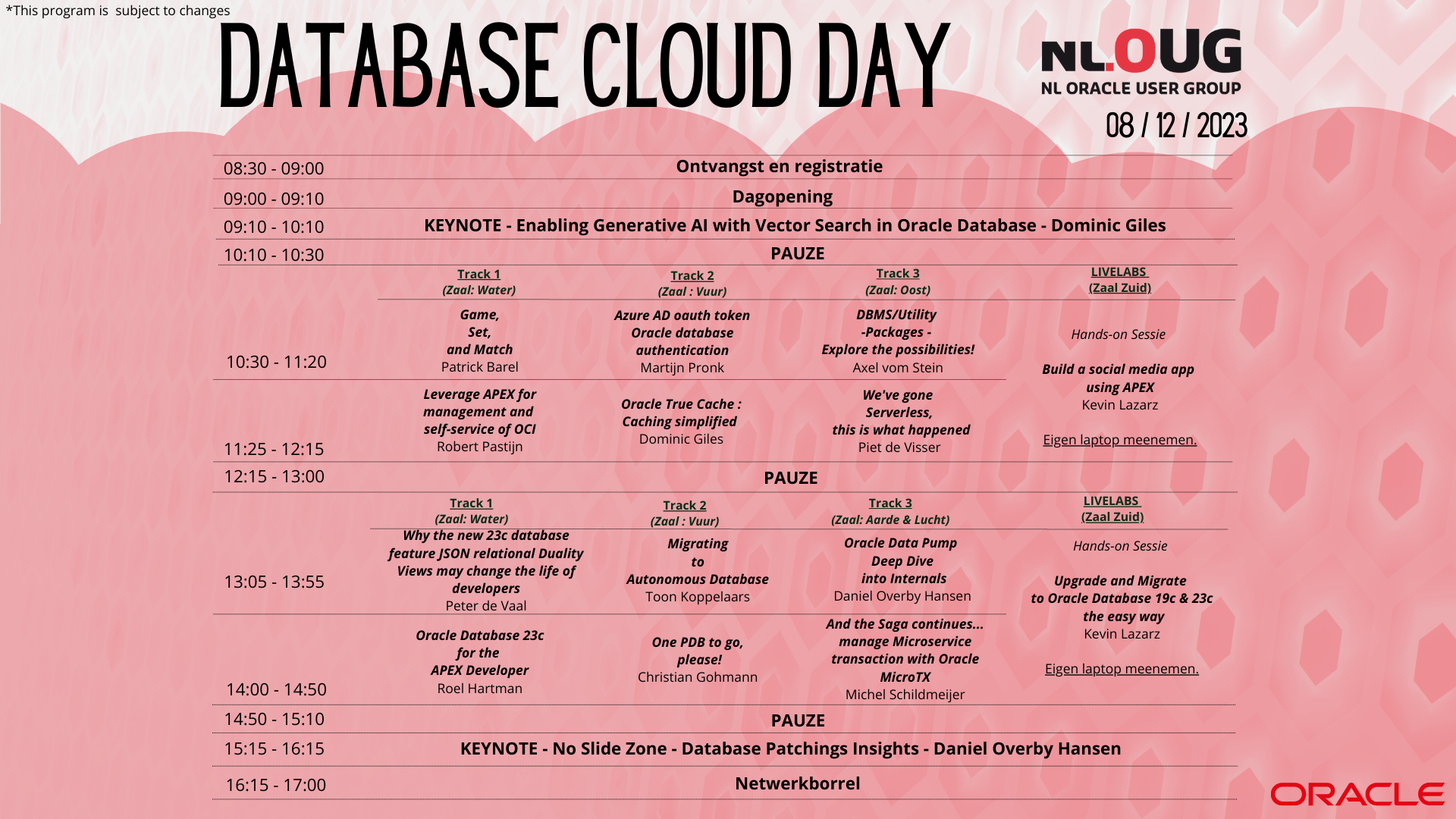Want to hear real-life stories about the Oracle database, for both DBA and Developer? Curious about JSON and how it combines with the relational database? Are you planning to migrate from on premises to cloud? And will you then go to Autonomous or not?